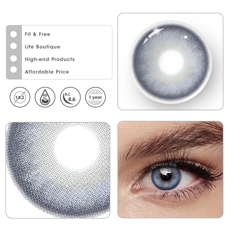 Water content: 40% Material: HEMA Base curve: 8.6mm Thickness: 0.08mm Diameter: 14.2mm Graphic Diameter: 13.7 mm Optical Zone: 3.5 mm Period of use: 12 months Packaging: 1 Pair (2 lenses) + Lens case *Packaging Updating. New and old packaging will be shipped randomly. *Lenses on different eye color will show different effects. Pictures for reference only. -Coloredeye