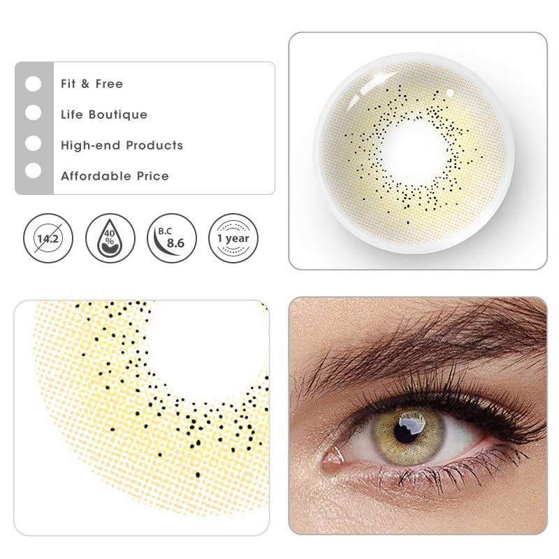 Water content: 40% Material: HEMA Base curve: 8.6mm Thickness: 0.08mm Diameter: 14.2mm Period of use: 12 months Packaging: 1 Pair (2 lenses) + Lens case *Packaging Updating. New and old packaging will be shipped randomly. *Lenses on different eye color will show different effects. Pictures for reference only. -Coloredeye