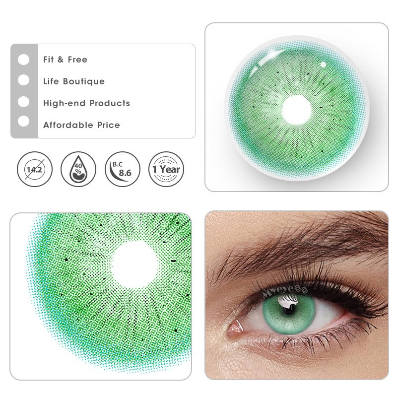 Water content: 42% Material: HEMA Base curve: 8.6mm Thickness: 0.08mm Diameter: 14.2mm Graphic Diameter: 13.9 mm Period of use: 12 months Packaging: 1 Pair (2 lenses) + Lens case *Packaging Updating. New and old packaging will be shipped randomly. *Lensesondifferenteyecolorwillshowdifferenteffects.Picturesforreferenceonly.