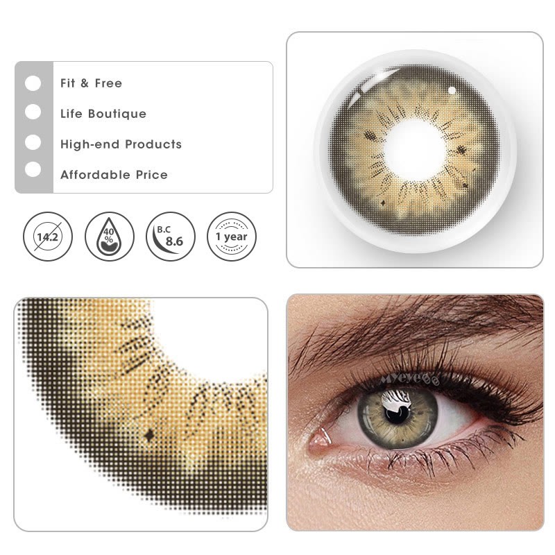 Water content: 40% Material: HEMA Base curve: 8.6mm Thickness: 0.08mm Diameter: 14.2mm Period of use: 12 months Packaging: 1 Pair (2 lenses) + Lens case *Packaging Updating. New and old packaging will be shipped randomly. *Lenses on different eye color will show different effects. Pictures for reference only. -Coloredeye